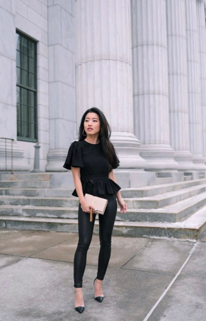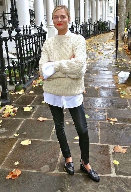 You can style the leggings with a shirt and chunky knit on top. I love wearing the black leggings with a black chunky knit and the shirt beneath in a beige/nude. I find the neutrals very classic and the shirt in a different colour breaks the monotony of black.